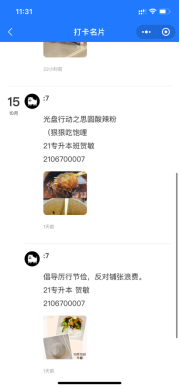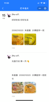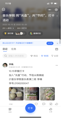 目前活动已进行两天,同学们积极参与,准时打卡。截至目前共有281名同学加入活动,共收到打卡800余次。许多同学表示通过此次活动更加深刻体会到艰苦奋斗、勤俭节约的中华传统美德,自己也养成了勤俭节约的好习惯。
