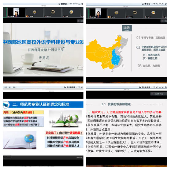 李教授带领教师们从更深层次讨论了学科与专业的关系,分析学科与专业的异同、学科发展的路径、再到欠发达地区师范类外语学科的发展现状,指出发展中的难点和堵点,同时也提供了可操作的出路。李教授还谈及到“新文科、大外语”的学术生态,外语学科的工具性和人文性等热点话题。结合江西师范大学外语学科的发展,分析欠发达地区高校外语学科及专业建设的思路。同时,根据师范专业认证的基本要求,重点解读专业认证的十二字理念,围绕“主线底线”“一践行三学会”“反向设计正向施工”关键术语,强调了在认证准备过程中需要特别注意的问题。