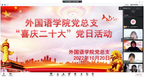 10月20日下午,外国语学院党总支组织开展了“喜庆二十大”主题党日活动,活动由学生第二党支部书记门宇老师主持,全体教职工党员、学生党员及发展对象参加了本次活动。