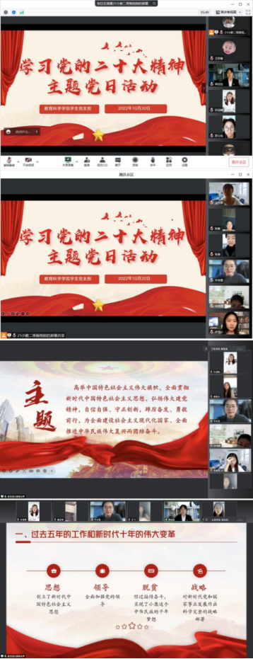 10月16日,中国共产党第二十次全国代表大会在北京隆重开幕。教育科学学院学生支部41名党员认真观看了开幕会直播盛况,聆听习近平总书记代表第十九届中央委员会向大会所作的报告。为了让党员学生更好地、积极地学习宣传贯彻党的二十大精神,引领学生与党同行、踔厉奋发、奋勇向前,10月20日,学生党支部利用腾讯会议平台召开了“学习党的二十大精神”主题党日活动,学生第一支部书记王璐然和41名学生党员参加了此次活动。
