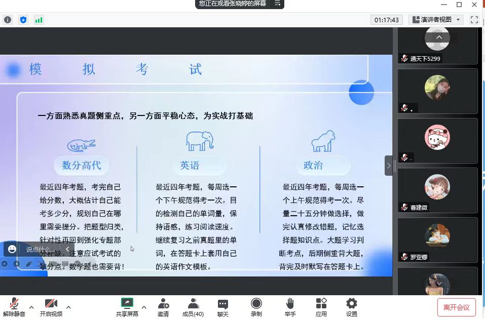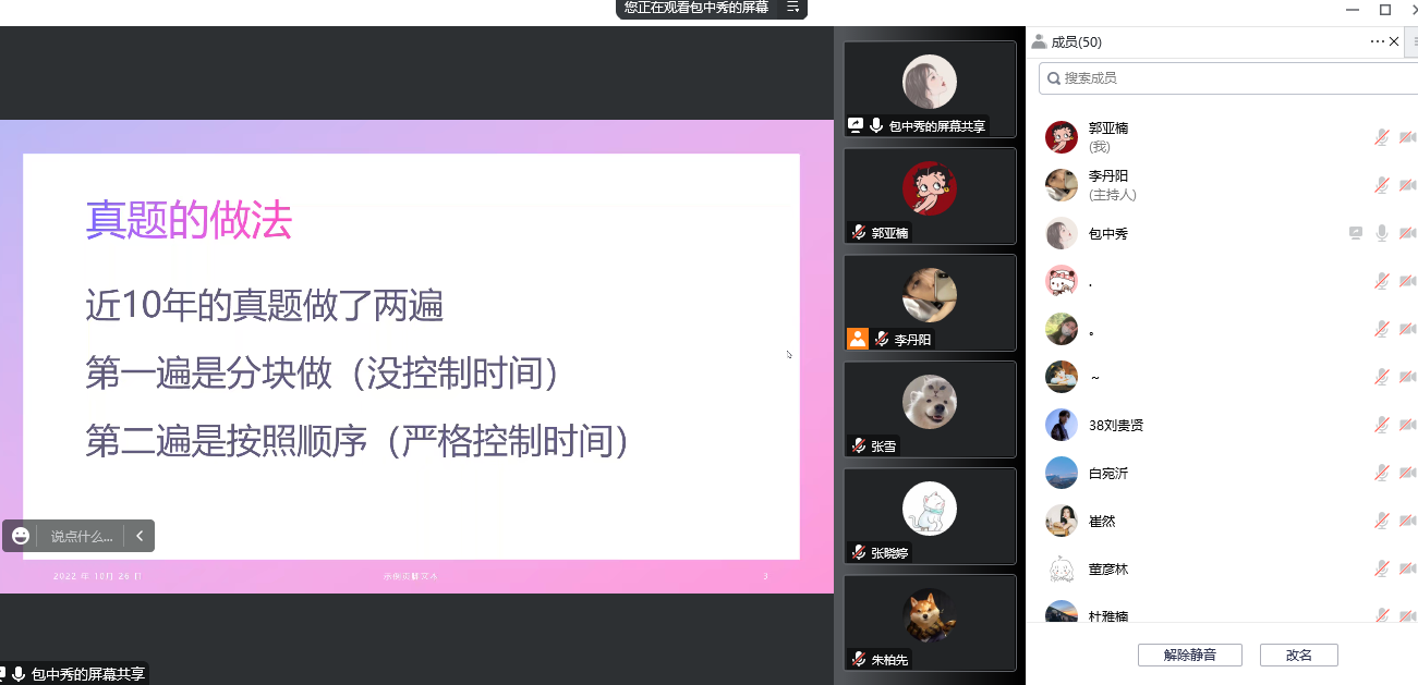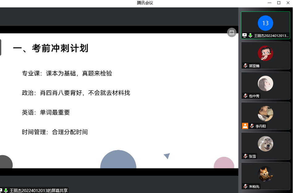 包中秀、王丽杰、李丹阳、张晓婷4位同学分别从专业课、公共课的备考特点出发,围绕“做习题夯实基础,听强化持续提升”,总结出不同的备考策略及提分技巧,如针对专业课有“课本为基础、真题来检验”的技巧;针对政治备考,有“肖四肖八要背好,不会就去材料找”的诀窍。因疫情影响,同学们只能在宿舍学习,部分同学学习效果不佳,复习节奏缓慢,大部分同学出现焦虑心理,针对这一情况,4位同学也纷纷支招,建议备考同学经常采用自我暗示、适度放松等方式调整心态,让2023届考研同学收获颇多。