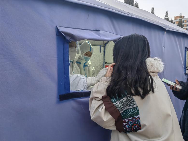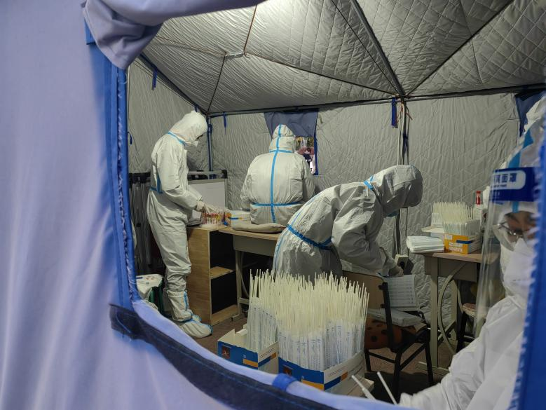 在核酸检测中,医务人员们做出了巨大努力,他们每天在天还未亮时就开始准备核酸检测的各种用品,整个上午身穿防护服,全身湿透,但仍一丝不苟,勤勤恳恳地完成核酸检测任务。