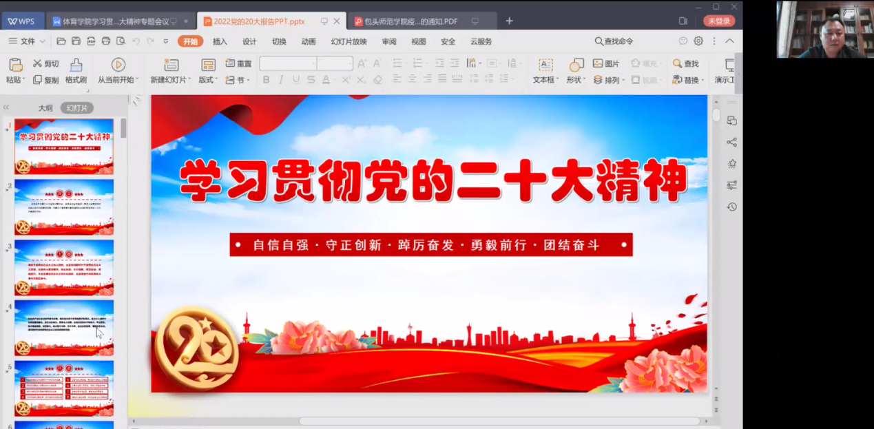为推动学习好宣传好贯彻好党的二十大精神,10月27日下午,体育学院在线上召开了学习宣传贯彻党的二十大精神专题会议,学院全体教职工参加了会议,党总支书记韩伟主持会议。
