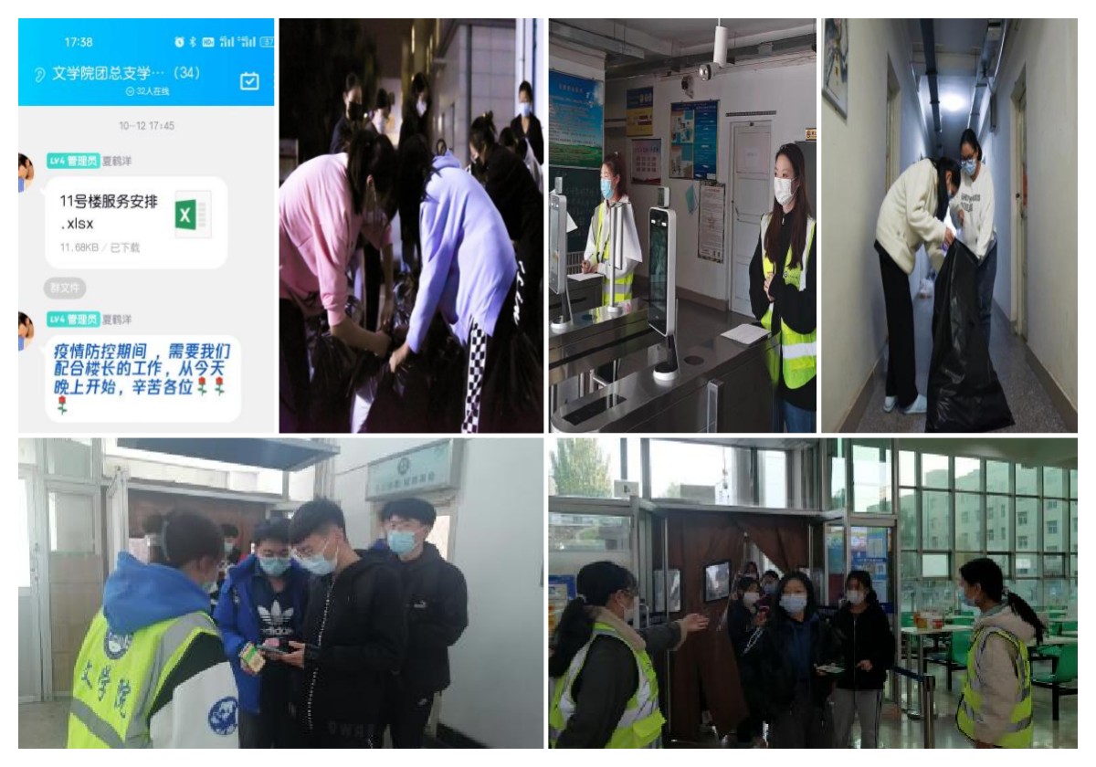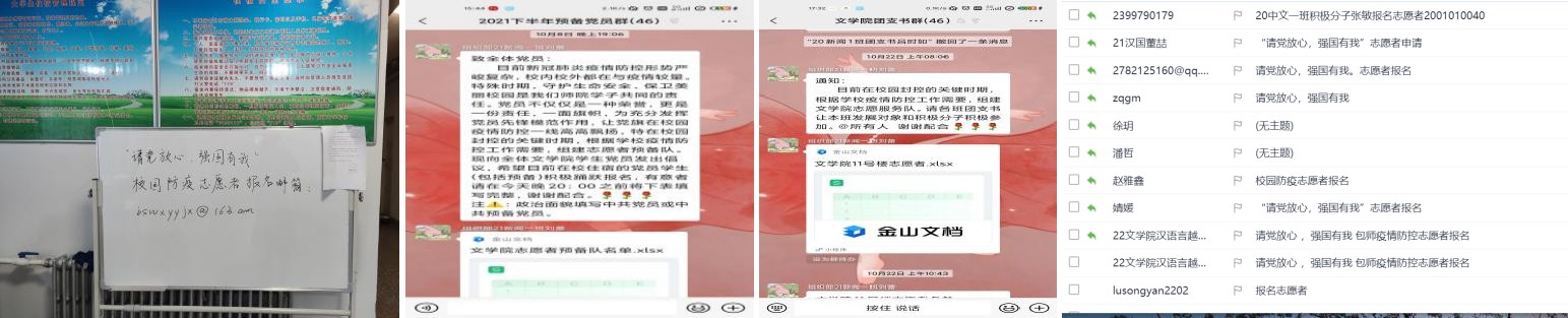 从疫情封校开始,文学院就开通了“请党放心、强国有我”校园防疫志愿者报名邮箱,在各微信群里发布了志愿者招募信息,成立了11号楼临时党支部,积极储备文学院志愿服务队伍。第一批储备志愿者为党员和预备党员共42人;第二批为11号楼党员和发展对象共29人;第三批为文学院团总支、学生会学生干部121人;19名学生自告奋勇担任11号楼楼层长和小组长;第四批招募公告发出之后有120名积极分子和青年学生积极报名参与志愿者预备队伍。