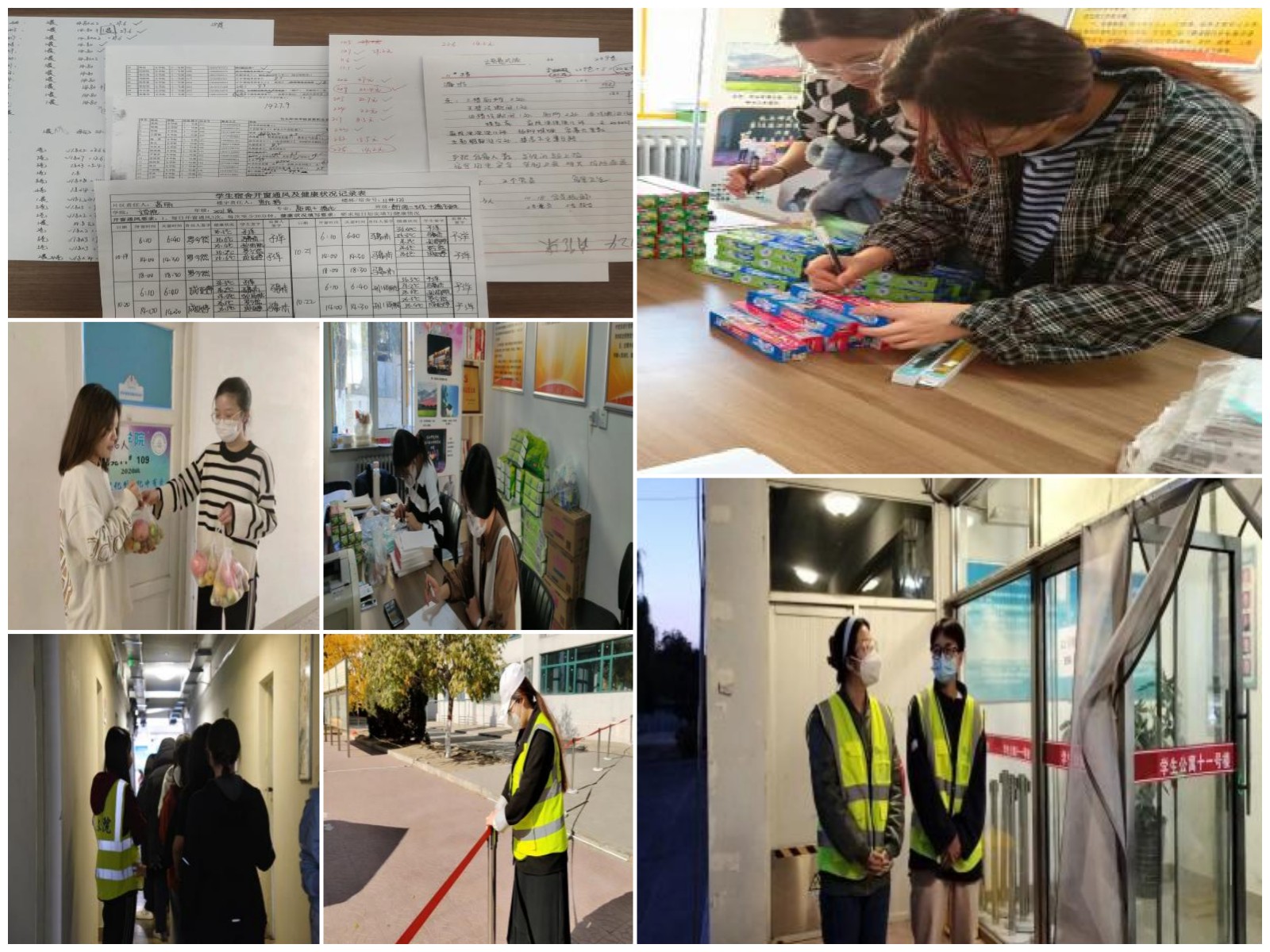 学生楼层长和组长们不计苦累、默默奉献,在10月12日提级管理至今,她们每天叫醒各层学生按时参加核酸检测、日常督促各层宿舍搞好卫生、进行消杀、开窗通风;分别在核酸、早餐、午餐、打水、晚餐后5次核查在寝人数;统计、运送、分发药品、生活必需品等物资的工作;协助楼长、老师进行楼内学生情绪疏导、陪同生病学生去校医院就医等工作。在11号楼内,总有她们服务学生的身影,她们构成包师抗疫的重要图景。
