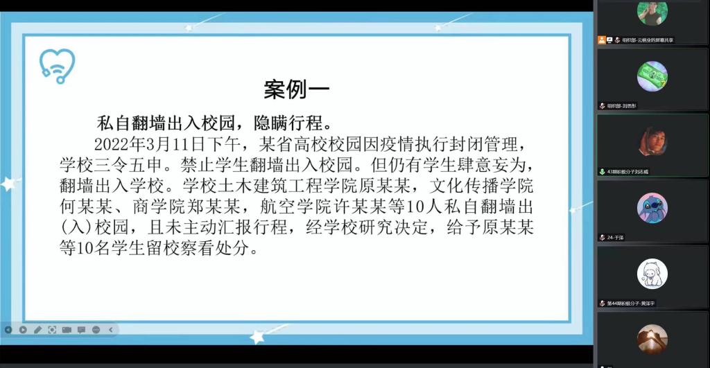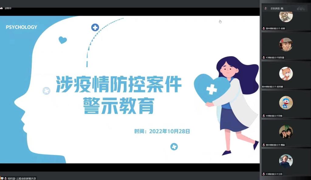 为加强学院学生在疫情防控期间的防范意识,严格规范自身行为,信息科学与技术学院于10月28日晚上20:00开展了“涉疫情防控案件警示教育大会”。信息科学与技术学院学生第一、二党支部书记王凝、姜嘉丽及学生支部党员、预备党员、积极分子参与会议。在本次会议上,老师通过让各位同学了解疫情期间涉疫防控案件,给同学们敲响了疫情防范和行为规范的警钟。