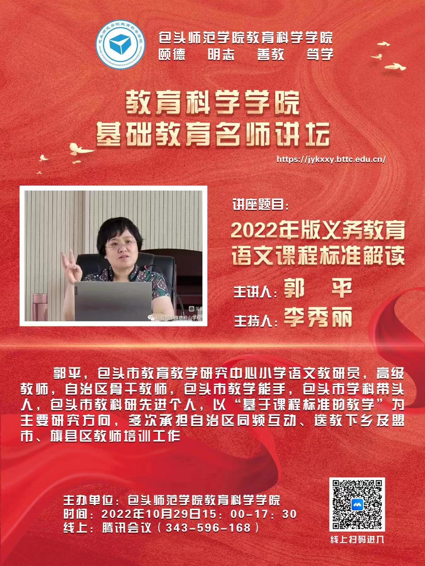 为进一步加强2019级小学教育专业毕业生校内实习的实效性,落实《义务教育课程标准(2022年版)》的新理念,全面提升师范生的课标解读、教材解读、教学设计能力,10月29日下午,教育科学学院邀请包头市教研中心郭平老师开展了新课标解读的在线讲座,教育科学学院小学教育专业师生聆听了此次讲座。