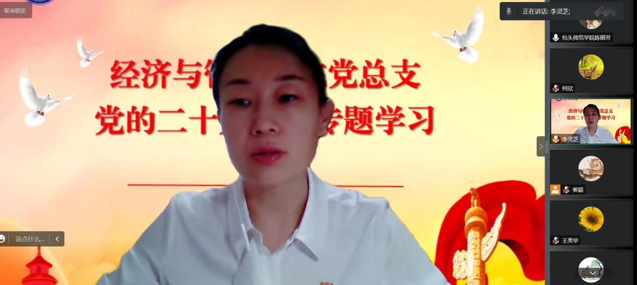 李灵芝强调,学习宣传贯彻党的二十大精神,是当前和今后一个时期全党全国的首要政治任务。经管学院要把学习宣传贯彻党的二十大精神作为重要议事日程,扎扎实实学习好。她带领全体教职工共同从“三个务必” “三件大事 “新时代十年的伟大变革”“第二个答案”“归根到底是两个‘行’”“两个结合”“六个必须坚持”“中国共产党的中心任务”“中国式现代化的中国特色”“中国式现代化的本质要求”“两步走战略安排”“五个重大原则”“全面建设社会主义现代化国家的首要任务、基础性、战略性支撑、应有之义、内在要求、战略要求”“推进国家安全体系和能力现代化”“提高人民军队打赢能力”“健全全面从严治党体系”“坚决打赢反腐败斗争攻坚持久战”“五个必由之路”方面梳理党的二十大报告。李灵芝强调,老师们要将二十大精神体现在课程思政中和课题申报等科研工作中体现;希望老师们重读二十大原文,深入领会精神,把学习贯彻党的二十大精神体现在实际行动和工作成效上。