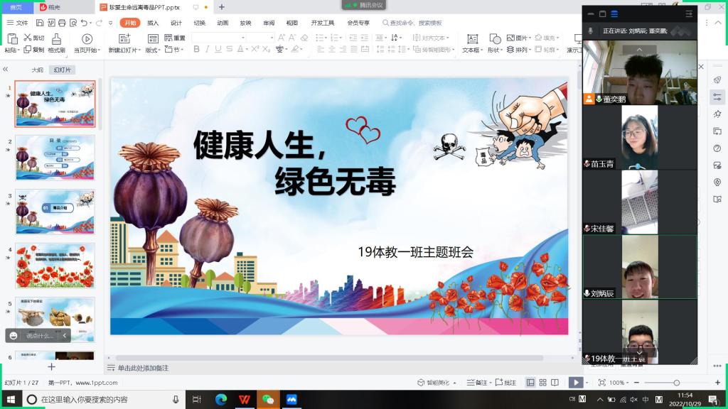 为全面贯彻贯彻习近平总书记关于青少年毒品预防教育工作的重要指示精神,有效防止学生吸毒等违法犯罪行为的发生,增强学生远离毒品、积极参与禁毒活动的意识,体育学院各班于10月中旬至下旬陆续开展了“健康人生、绿色无毒”线上主题班会课活动。全面普及在校学生识毒防毒拒毒知识,全力打赢新时代禁毒人民战争,助力平安校园建设,打造无毒校园。