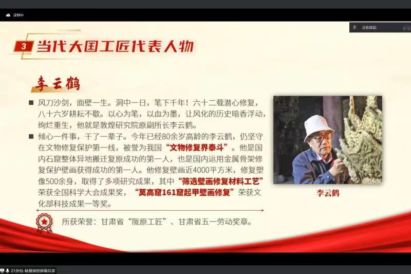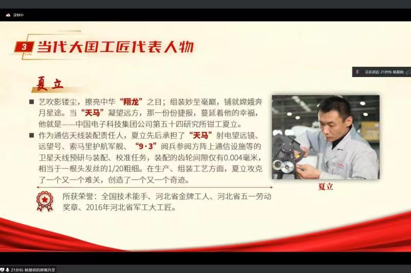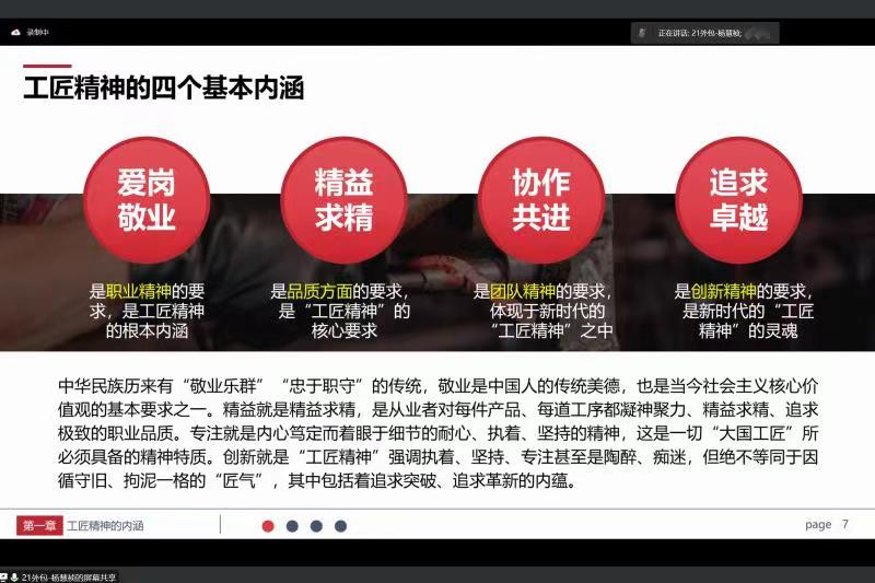 同学们首先了解了什么是工匠精神以及工匠精神的四个基本内涵分别是爱岗敬业、精益求精、协同共进、追求卓越;其次,学习了工匠精神对国家、对企业、对个人的意义;再次,领悟了李云鹤、夏立等当代大国工匠代表人物背后的故事和蕴含的时代精神;最后,畅谈了作为新时代大学生应当如何培养工匠精神,如何自我修炼工匠精神,总结出了六个要点,五种学习方法。