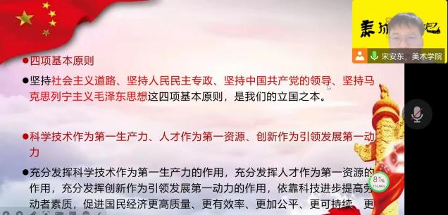 党支部书记宋安东同志紧扣学习重点、认真把握条目、深入浅出地讲解梳理,归纳出新党章的新特点:一是把党的十九大以来习近平新时代中国特色社会主义思想的新发展写入党章;二是把党的初心使命、党的百年奋斗重大成就和历史经验的内容写入党章;三是把全面建设社会主义现代化国家、以中国式现代化全面推进中华民族伟大复兴的奋斗目标写入党章;四是把党的十九大以来以习近平同志为核心的党中央坚持和加强党的全面领导、推进全面从严治党的新鲜经验写入党章。他号召学生党员同志在学习生活中发挥先锋模范作用、把伟大的建党精神和新党章新要求落在行动中。(美术学院)