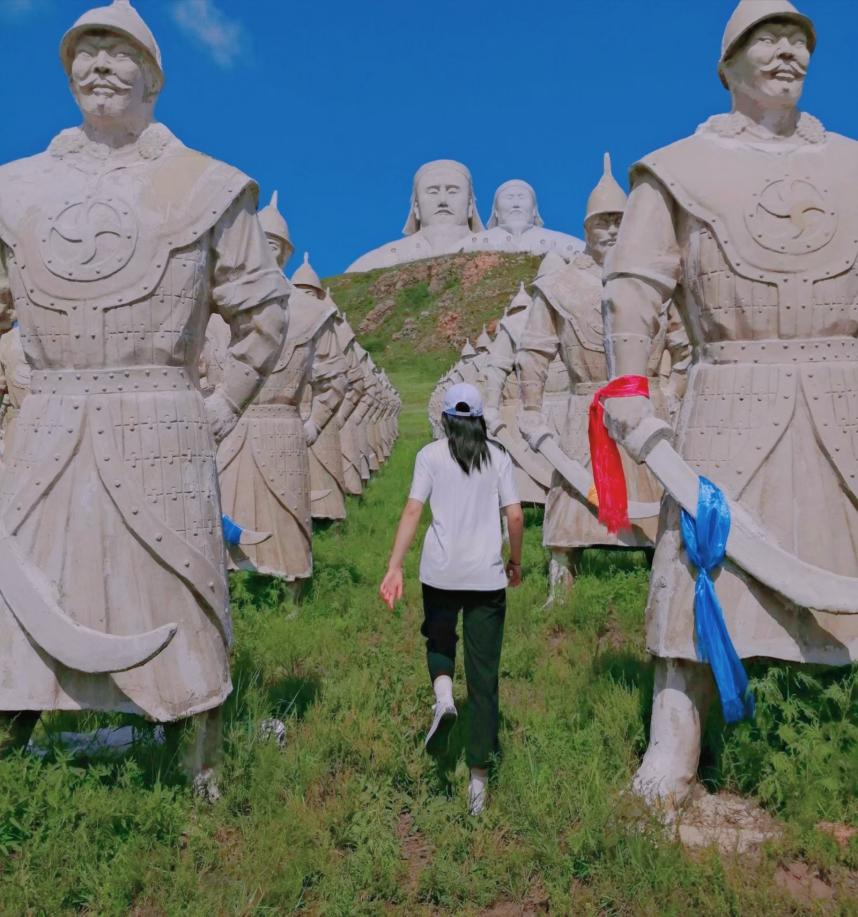 霍林格勒郊区的可汗山,成吉思汗和忽必烈的巨大石像矗立其上,气势恢宏。历时两小时终于爬到了山顶,虽是气喘吁吁,但仍被这壮观的场面所震撼。“弯弯霍林河,悠悠古城垣。” 可汗山映入眼前的是两位骑着大马的两员大将的塑像,看上去威风凛凛,山下的蒙元方阵更是震撼,两位大汗王的塑像栩栩如生,特别威严庄重。忆往昔峥嵘岁月,看今朝辉煌。爬完山不禁感慨祖国大好河山的壮丽,英雄的英勇善战。我们的祖国山水壮丽,幅员辽阔,这就是为什么我对这片土地爱得深沉,爱得陶醉。