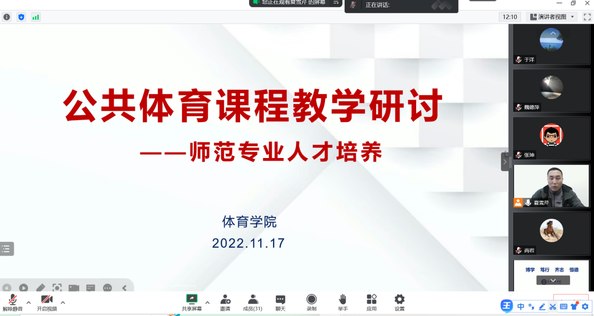 为进一步推进体育学院公共体育课程体系建设,更新教育理念,深化教学改革,促进大学体育高质量发展,体育学院于11月17日召开了公共体育课程教学研讨会。35名公共体育课程授课教师参加会议,体育学院副院长夏雪芹主持会议。