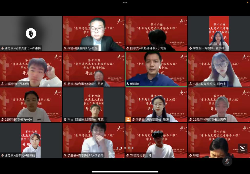 为深入学习贯彻党的二十大精神,进一步加强学生干部思想认识和自身建设,物理科学与技术学院于11月27日晚7点召开第16期青年马克思主义者培养工程暨大学生骨干培训班开班仪式。学院党总支副书记郭凯敏、辅导员郑霞及学院全体学生干部参加了本次培训。