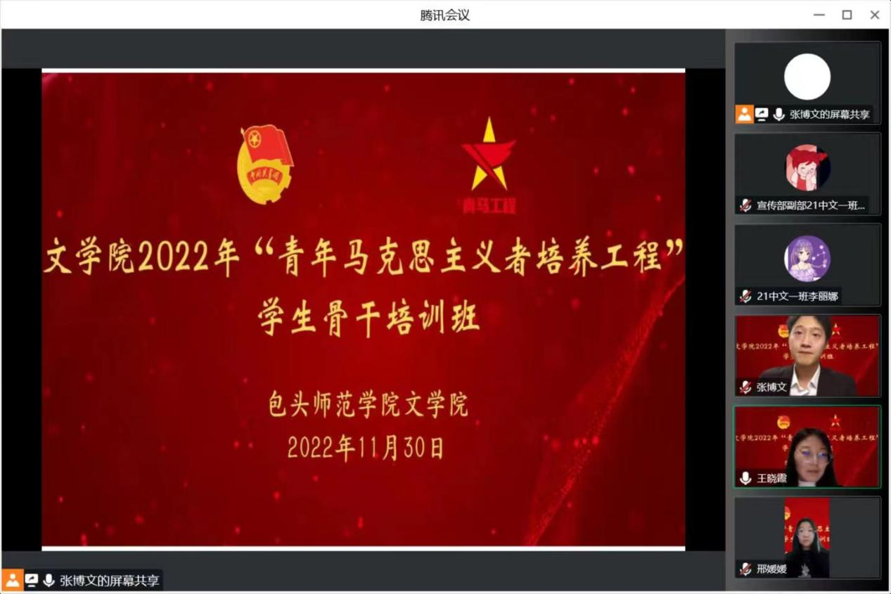 为引导学院团员青年全面准确理解马克思主义中国化的最新成果,深入学习宣传贯彻党的二十大精神、党的百年奋斗重大成就和历史经验,继承马克思主义青年观的基本原则,培养一批有理想、有担当、有本领的青年马克思主义者,牢固树立永远跟党走,做党和国家事业的合格建设者和可靠接班人的意识2022年11月30日,文学院“青年马克思主义者培养工程”学生骨干培训班正式开班,文学院辅导员老师王晓霞、团总支副书记邢媛媛、学生会主席张博文及140位参训学员参加了开班仪式。本次青马班培训对象为文学院团总支、学生会及社团联合会全体学生干部,21、22级各班组织委员与宣传委员。