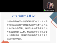为做实做细大学生就业指导工作,引导学生树立正确的成才观、职业观和就业观,积极到基层建功立业,11月26日,外国语学院召开线上选调生经验分享会,邀请成功考录选调生的2022届优秀毕业生蔚媛媛、姚庆同学分享备考经验。分享会由学工办负责人门宇老师主持。