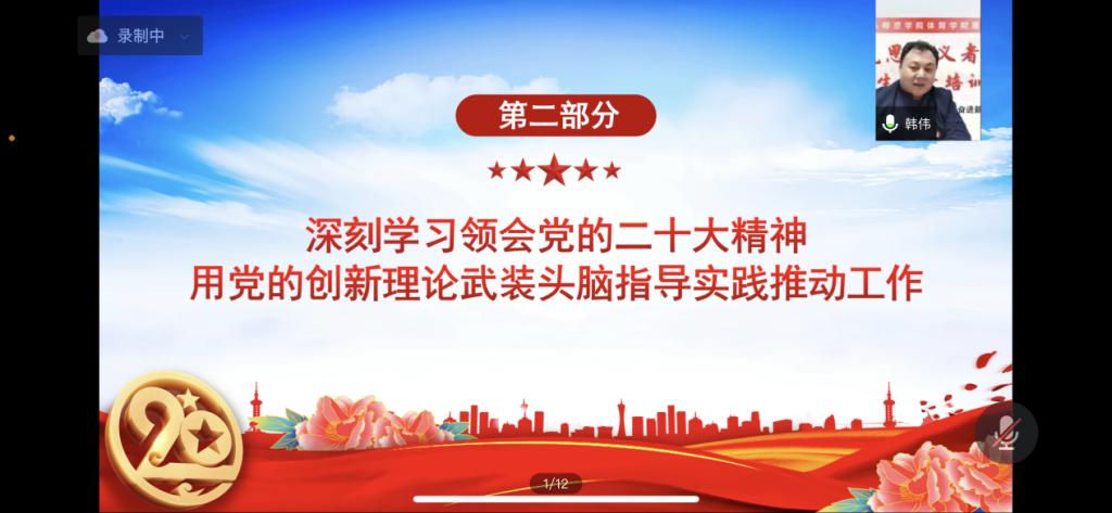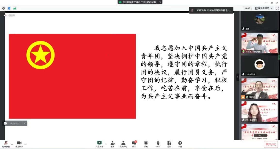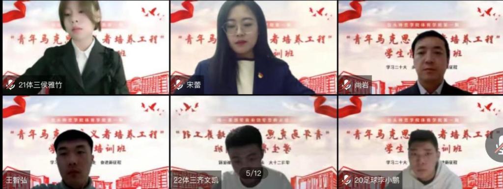 12月1日,体育学院“青年马克思主义者培养工程”学生骨干培训班开班仪式在线上举行。学院党总支书记韩伟、党总支副书记尚岩、学工办全体教师出席本次开班仪式,团总支、学生会现任职全体学生骨干以及各班团支书、班长共81名学员参加了仪式。开班仪式由团总支负责人安世洁主持。