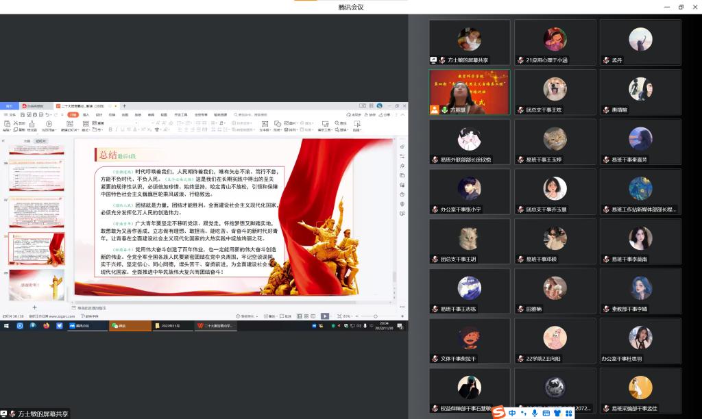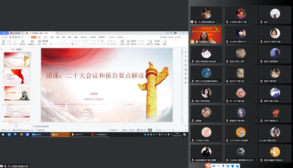 为深入学习党的二十大会议精神,使学生干部和青年骨干坚定理想信念、筑牢信仰之基,教育科学学院于11月30日19:00在腾讯会议上举办第四期“青马工程”培训班第一场专题讲座---二十大会议和报告要点解读。讲座由团总支书记方丽慧主讲,全体学生干部参加了本次活动。