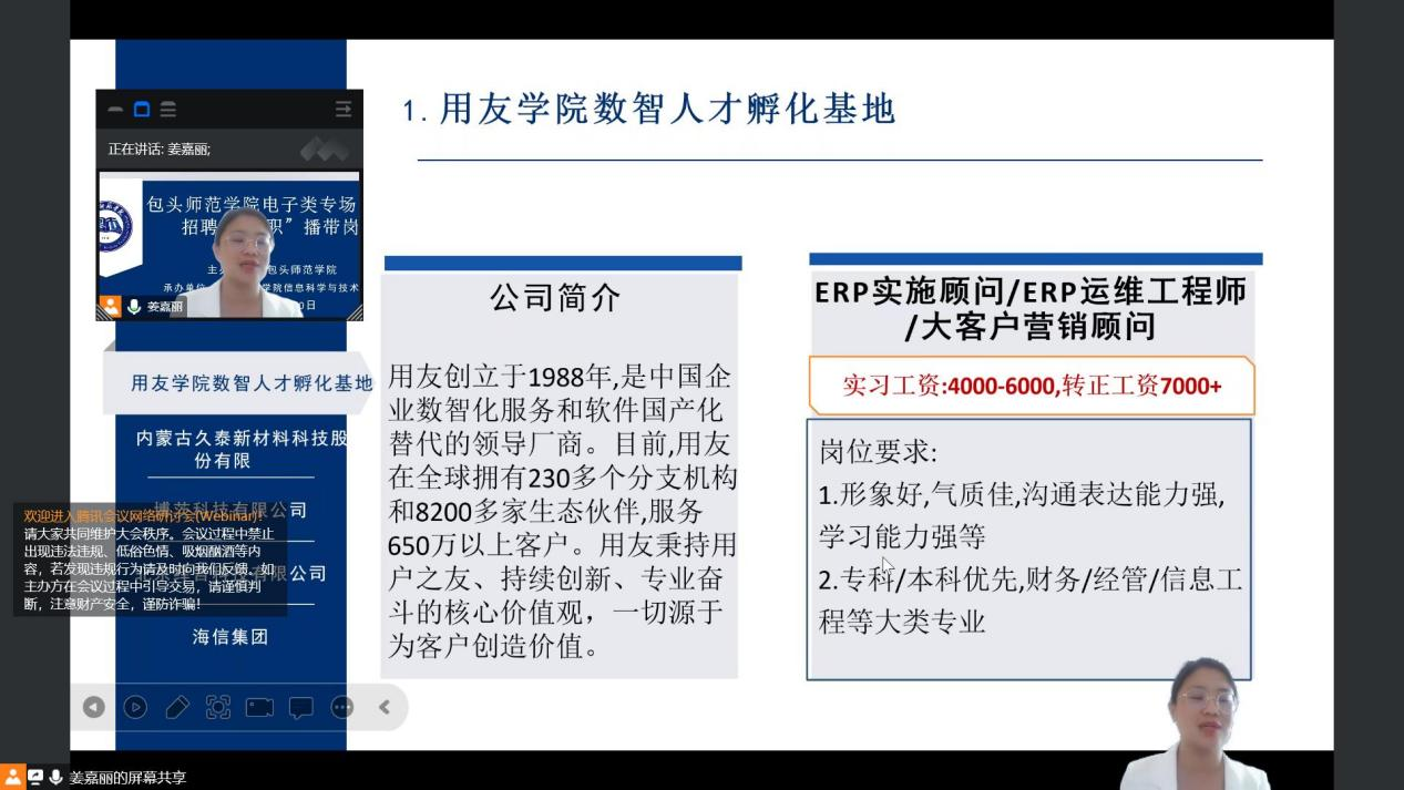 11月20日下午,由学校招生就业处主办,信息科学与技术学院承办,共同组织开展了包头师范学院电子信息类专场招聘会。本次“职”播带岗活动由信息学院辅导员姜嘉丽老师担任主播。