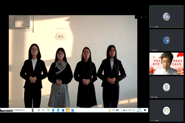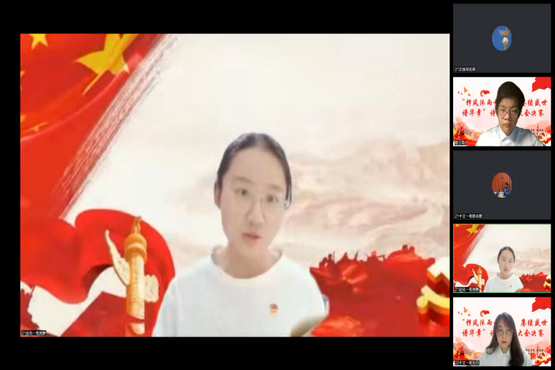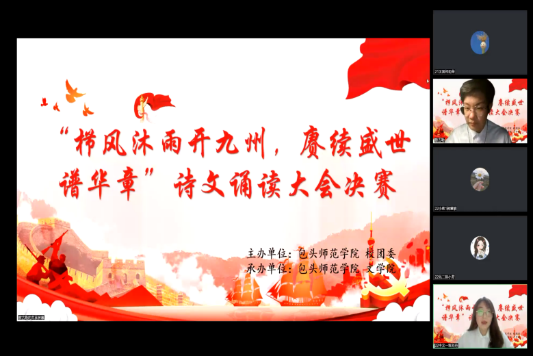 为弘扬中华民族优秀传统文化,保持学生学习党史的热情、增强学生听党话、跟党走的信念,引导广大青年做有理想、敢担当、能吃苦、肯奋斗的新时代好青年,12月1日晚7点,由校团委发起,文学院举办的“栉风沐雨开九州,赓续盛世谱华章”诗文诵读大会决赛于线上举行。文学院播音与主持艺术专业系主任单新宇、播音与主持艺术专业专任教师王语岑、汉语言文学专业专任教师武慧敏、辅导员白斯琴作为本次活动的评委,为参赛作品打分。文学院副院长李国德、辅导员王晓霞作为嘉宾应邀出席。