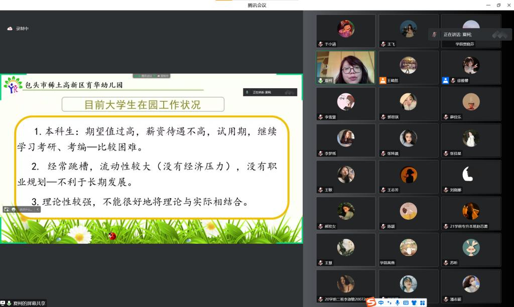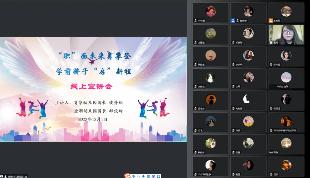为使学前教育专业学生尽早了解就业形势,转变择业就业观念,找准就业方向,优化职业发展路径,教育科学学院于12月1日下午15:00在腾讯会议举办“‘职’面未来勇攀登,学前骄子‘启’新程”就业线上宣讲会。