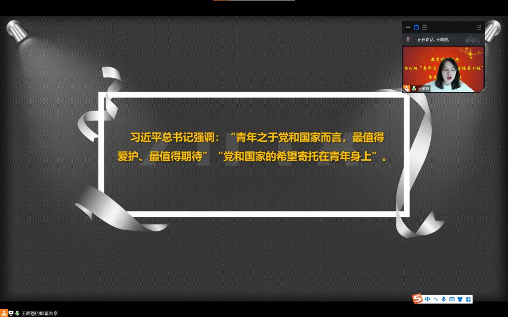 为进一步加强学生干部队伍建设,提升学生干部工作能力水平,12月1日晚7时,教育科学学院在线上开展第四期“青马工程”培训班第二场专题讲座---学生干部素质培养与能力提升。讲座由辅导员王璐然主讲,全体学生干部参加了本次活动。