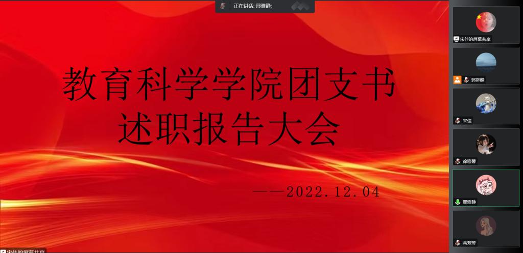 为全面总结学院各团支部2022年工作,进一步深化共青团改革,落实全面从严治团要求,推动团支部不断提升组织力,促进经验交流,12月4日下午,教育科学学院召开团支书述职报告大会,学院团总支书记方丽慧、副书记徐雅馨,团总支干部和各支部书记参加了会议。