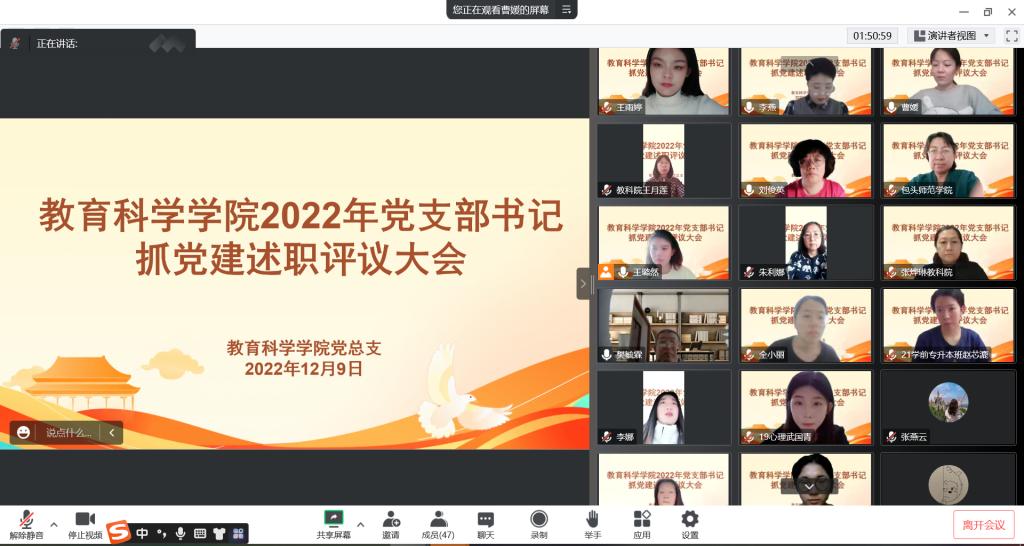 根据《党委组织部关于做好2022年度党组织书记抓基层党建述职评议考核工作的通知》要求,2022年12月9日下午15:00,教育科学学院在腾讯会议召开党支部书记抓党建述职评议大会。教育科学学院党总支委员、党支部书记、全体党员教师和20名学生党员代表参加了会议。会议由党总支副书记李燕主持。