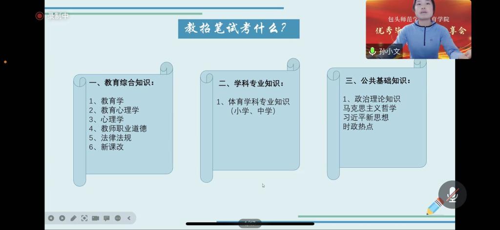 目前就职于乌拉特前旗第三小学的高旭、昆都仑区团结大街第三小学的孙小文和锡林浩特市第五小学的宋智超三位优秀毕业生分享了备考呼和浩特、鄂尔多斯、包头等地的考情,重点分析了各地教招考核侧重点。并为大家讲解了笔试、面试的学习方法,以及备考的注意事项。通过自己成功的经历,给19级即将面临就业的同学们明确了努力的方向。