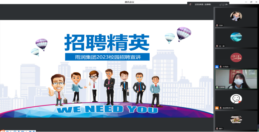 为进一步拓宽2023届毕业生就业渠道,向毕业生提供精准就业服务,12月19日上午10点,雨润集团在生物科学与技术学院举办2023届毕业生线上专场宣讲招聘会,生物科学与技术学院党总支副书记刘一峰、辅导员魏冬、张晓芳出席了本次活动,2019、2020级部分生物科学、生物技术专业学生与会。雨润集团负责人王婷婷、汪强经理主讲了此次宣讲会。