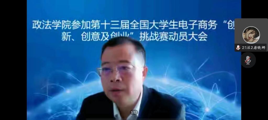 为迎接我校“第十三届大学生电子商务创新、创意及创业挑战赛”校赛省赛,多出高质量参赛项目,2022年12月26日上午,政治与法律学院在腾讯会议上召开了参加第十三届全国大学生电子商务“三创”挑战赛动员大会。学院党总支副书记郭宏升出席了会议,大一到大三各班班委会、团支部、宿舍长等近300人参加了会议。会议由辅导员赵鹏然老师主持。