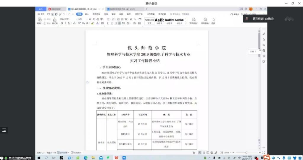 白然然老师对2019级微电子班本学期的实训实践情况进行汇报,除根据实训内容完成毕业设计相关工作外,还对学生进行就业培训,从求职简历的制作、模拟面试的表现、着装礼仪的注意事项等几方面分别介绍,帮助学生顺利通过面试环节。