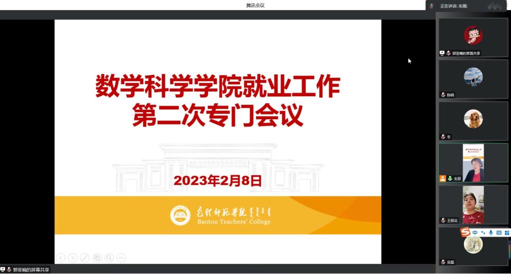 为严格落实学校寒假就业工作推进会的各项工作部署,扎实做好2023届毕业生就业工作,数学科学学院于2023年2月8日召开线上2023届毕业生就业工作推进会。数学科学学院党总支书记朱丽及副院长徐国明、实验室主任董金茂、系主任薛英、办公室主任王丽花、学工办负责人宋金锦、就业工作辅导员郭亚楠以及全体毕业班班主任等13人参加会议。