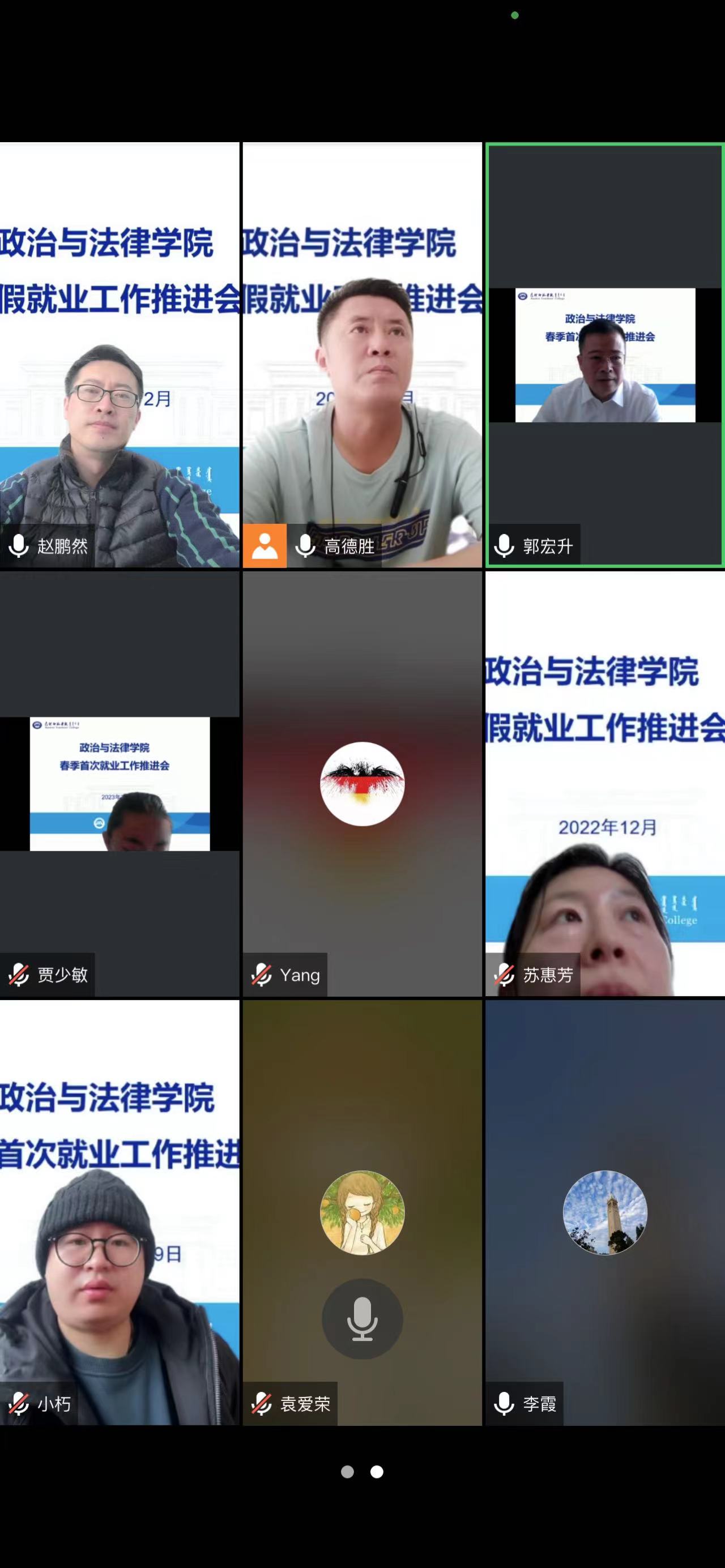 为贯彻落实教育部、教育厅有关会议和我校寒假就业工作推进会精神,2023年2月9日上午,政治与法律学院线上召开了2023届毕业生春季首次就业工作推进会。学院党总支书记高德胜、副书记郭宏升、副院长李霞、学工办主任、毕业班班主任、辅导员参加了会议。会议由院党总支书记高德胜主持。