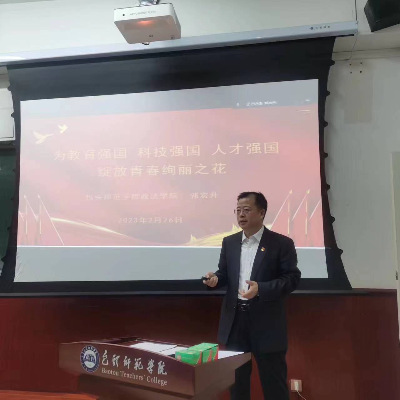 为贯彻落实我校开学第一课文件通知精神,以饱满的精神状态迎接新的学期,使同学们更快的适应校园生活,2023年2月26日下午,政法学院郭宏升副书记在博学楼东602教室和腾讯会议,为本院学生讲授“为教育强国 科技强国 人才强国绽放青春绚丽之花”的开学第一课。大一到大四级各班班长、团支书、学习委员、宣传委员等300多人,分别在线下线上参与了此次活动。