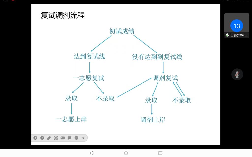 王丽杰、李丹阳、王彦媛3位同学分别从调剂的流程方法及专业课、公共课的面试特点出发,围绕“调剂信息来源,面试流程解析”,总结出丰富的调剂策略及面试技巧,如针对调剂有“规避信息差,寻找信息源”的技巧;针对面试备考,有“实战练习法,框架图总结”的诀窍。考研复试发生了极大的变化,部分同学对未知情况出现焦虑心理,针对这一情况,3位同学也纷纷支招,建议备考同学采用实战演练、适度放松等方式加强练习、调整心态,让2023届考研同学收获颇多。