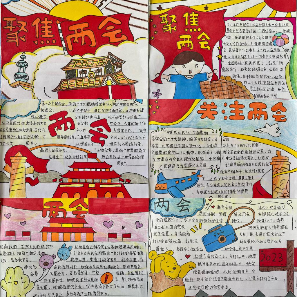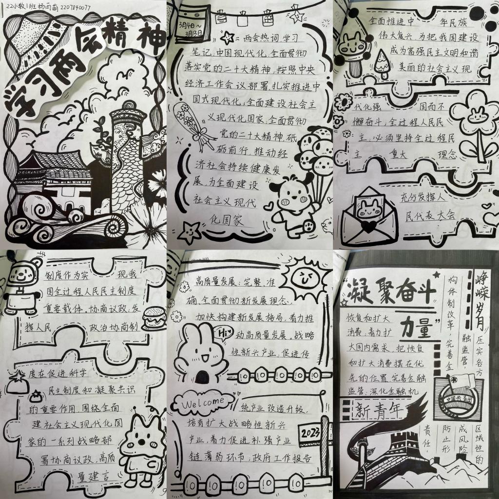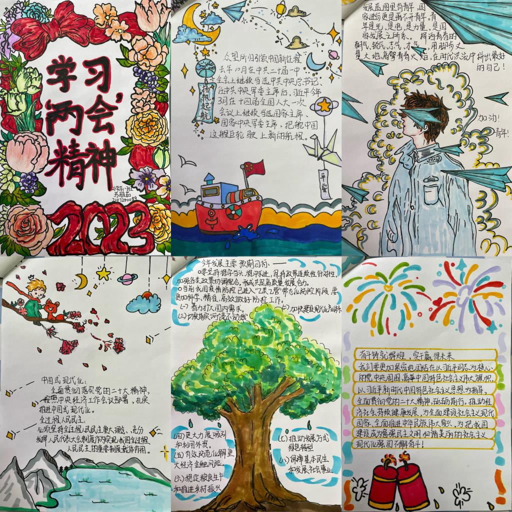 本次活动要求同学们连续五日学习“两会”精神,并以手账的形式记录祖国的成就与期待,活动共征集到近百份作品。有的同学记录了过去一年和五年工作取得的成就;有的同学对“中国式现代化”、“全过程人民民主”、“高质量发展”、“平安中国”等“两会”热词进行了认真解读;还有的同学记录了2023年的工作展望和预期目标。手账图文并茂、布局合理,色彩丰富、契合主题,画出了对国家蓝图的畅想,同时反映了同学们对“两会”精神学习的认真态度,展现了同学们积极向上、爱党爱国的良好精神面貌。