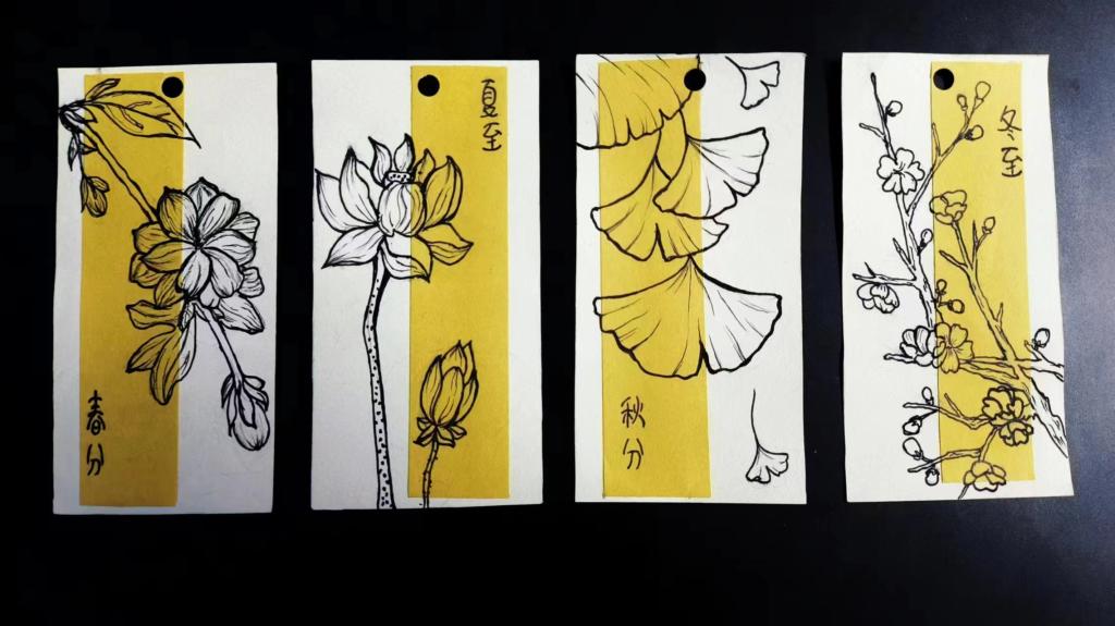 此次活动共收到60余份作品,每位同学以绘制4张书签为一组来展示二十四节气。作品设计新颖、精致美观,带有浓厚的传统文化气息。有的同学制作了带有桃花的书签;有的同学选择用带有过渡的绿色来画出清明时节雨纷纷的场景,一笔一画中尽显萧瑟;有的同学用娟秀的文字点缀在书签上,文字和书签上的大雁呼应,别有一番风味;有的同学用水彩颜料,画出惊蛰节气的昆虫形态;还有的同学在书签画出刚长出芽的麦穗和稻草人。