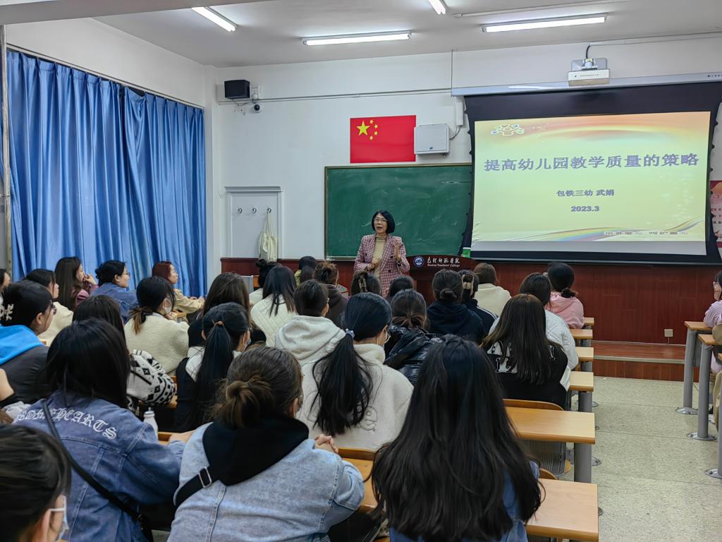 3月20日昆区教育局面向包头师范学院定向招聘幼儿园教师报名后,为了帮助学生提升教学设计和试讲能力,教育科学学院于3月20日晚召开了2023届学前教育专业毕业生教学能力提升讲座,讲座专家为包铁三幼武娟园长。2023届全体学前教育专业毕业生及学前教育专业研究生参加讲座。