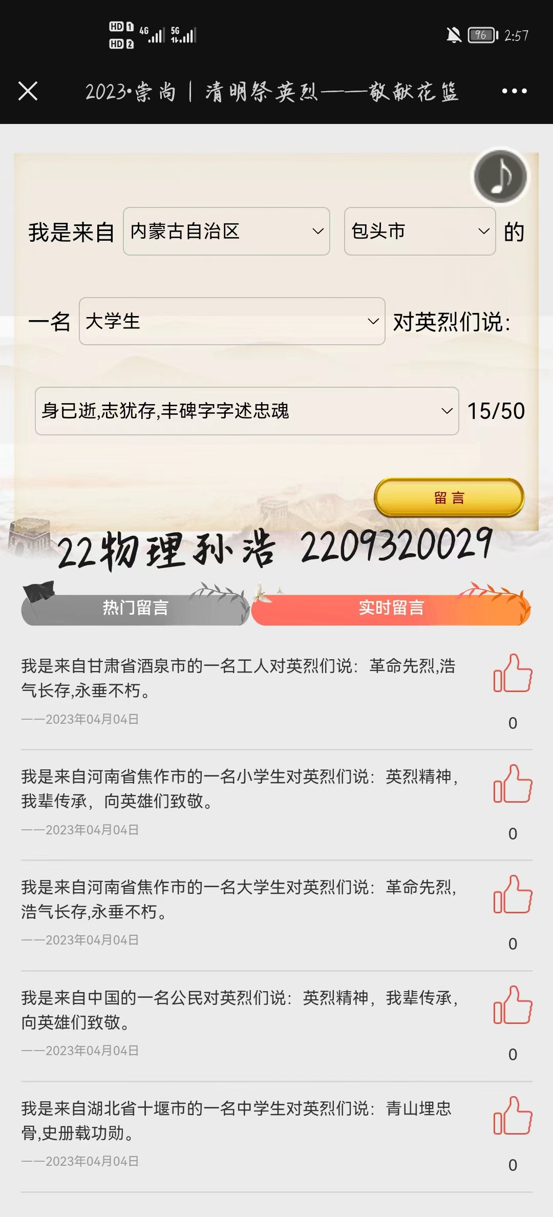 为深入贯彻习近平总书记关于英烈褒扬工作的重要指示批示精神,进一步加强学生爱国主义教育,传承红色基因,弘扬英烈精神。4月3日-4月4日,物理科学与技术学院组织全院学生开展“网上祭英烈文明寄哀思”清明节主题教育活动。