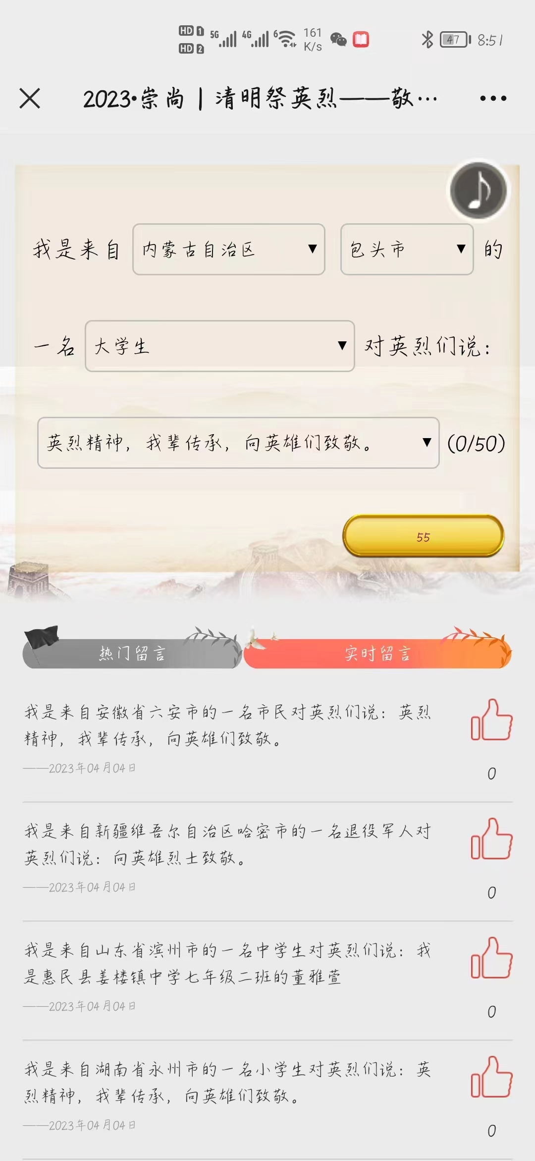 活动期间,全体学生登录中华英烈网移动端页面,积极参与网上祭扫活动,采用网上瞻仰烈士纪念碑、鞠躬献花、留言寄语等形式寄托哀思,并在网上认真浏览革命先烈的英雄事迹、观看视频展播、学习英烈故事,表达对先烈先辈的感恩怀念,缅怀敬仰之情。