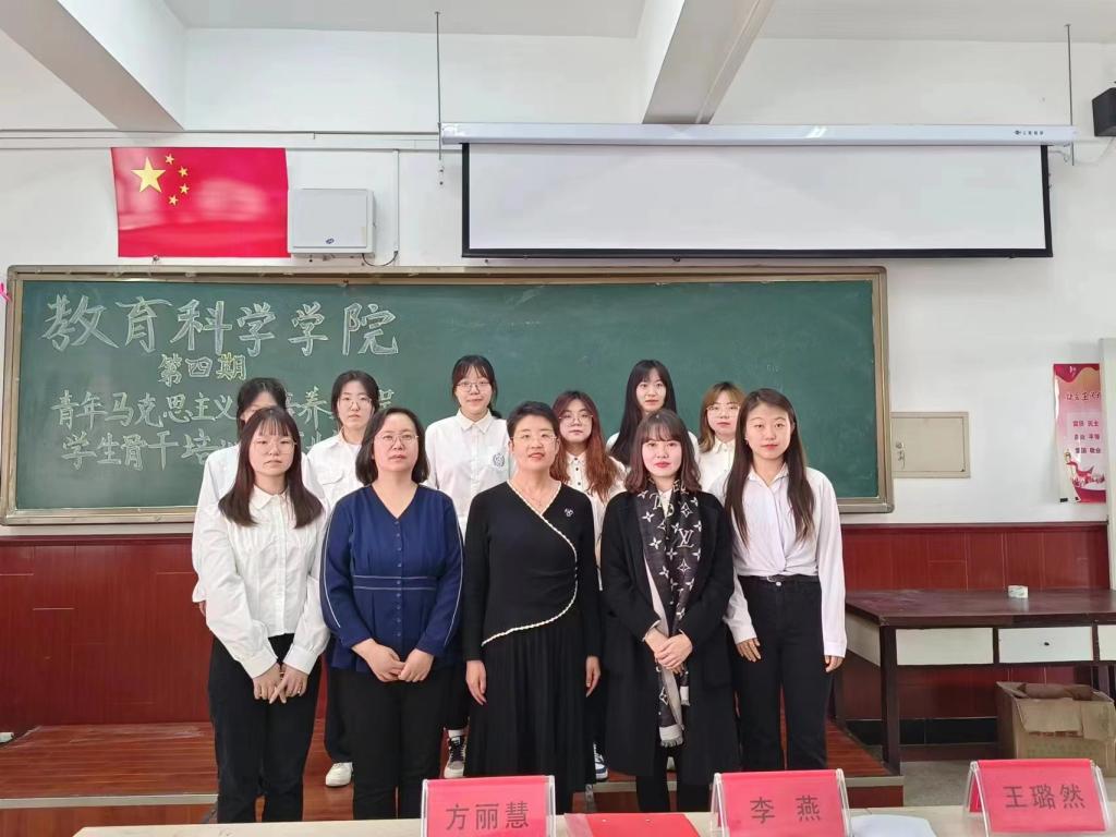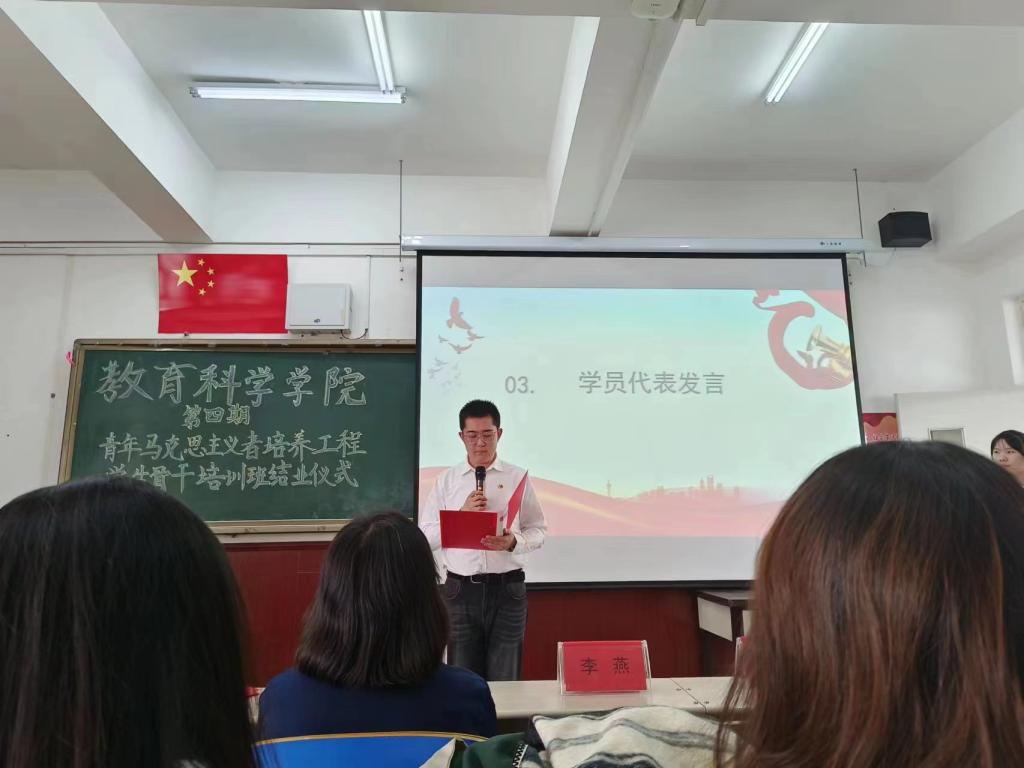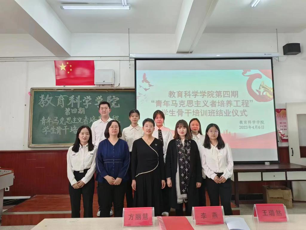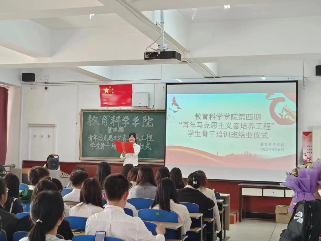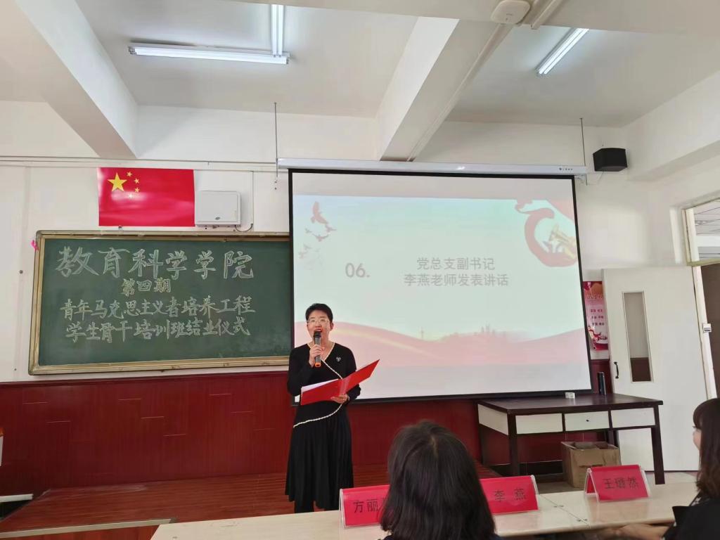 为深入学习贯彻党的二十大精神和习近平总书记关于青年工作的重要思想,落实《中长期青年发展规划(2016—2025年)》文件要求,为党培养信仰坚定、能力突出、素质优良、作风过硬的学生骨干,教育科学学院自2022年11月29日组织开展了第四期“青年马克思主义者培养工程”学生骨干培训班。学院通过专题讲座、影视教育、知识竞赛和素质拓展等多种培训形式,已顺利完成全部培训内容,于4月6日下午在博600举行了教育科学学院第四期“青年马克思主义者培养工程”学生骨干培训班结业仪式。党总支副书记李燕、团总支书记方丽慧、辅导员王璐然、学生干部代表及141名参训学员参加了结业仪式。