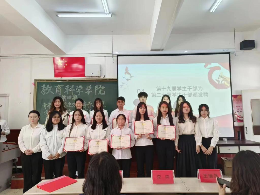 第三项议程,第十九届学生干部代表为第二十届学生干部颁发任职聘书。团总支副书记徐雅馨、学生会执行主席李珂萱等人代表第二十届学生干部为第十九届学生干部献花。