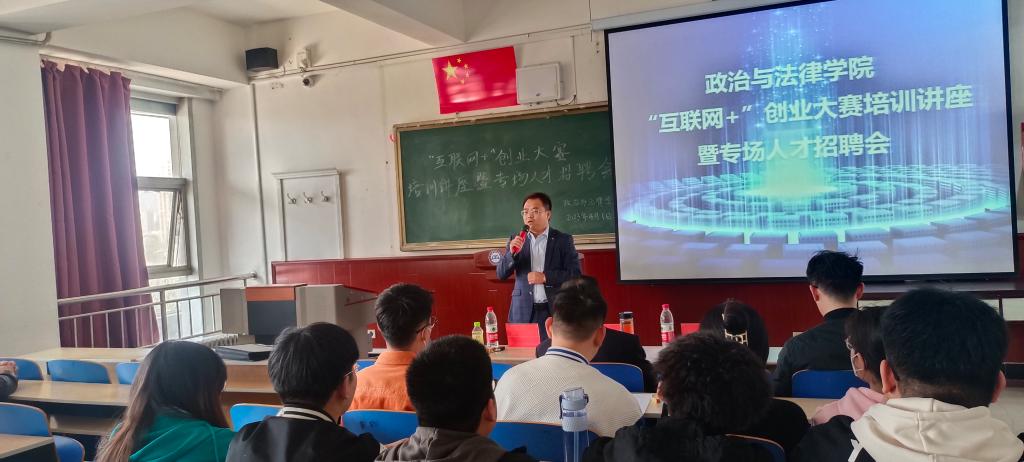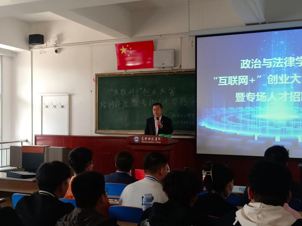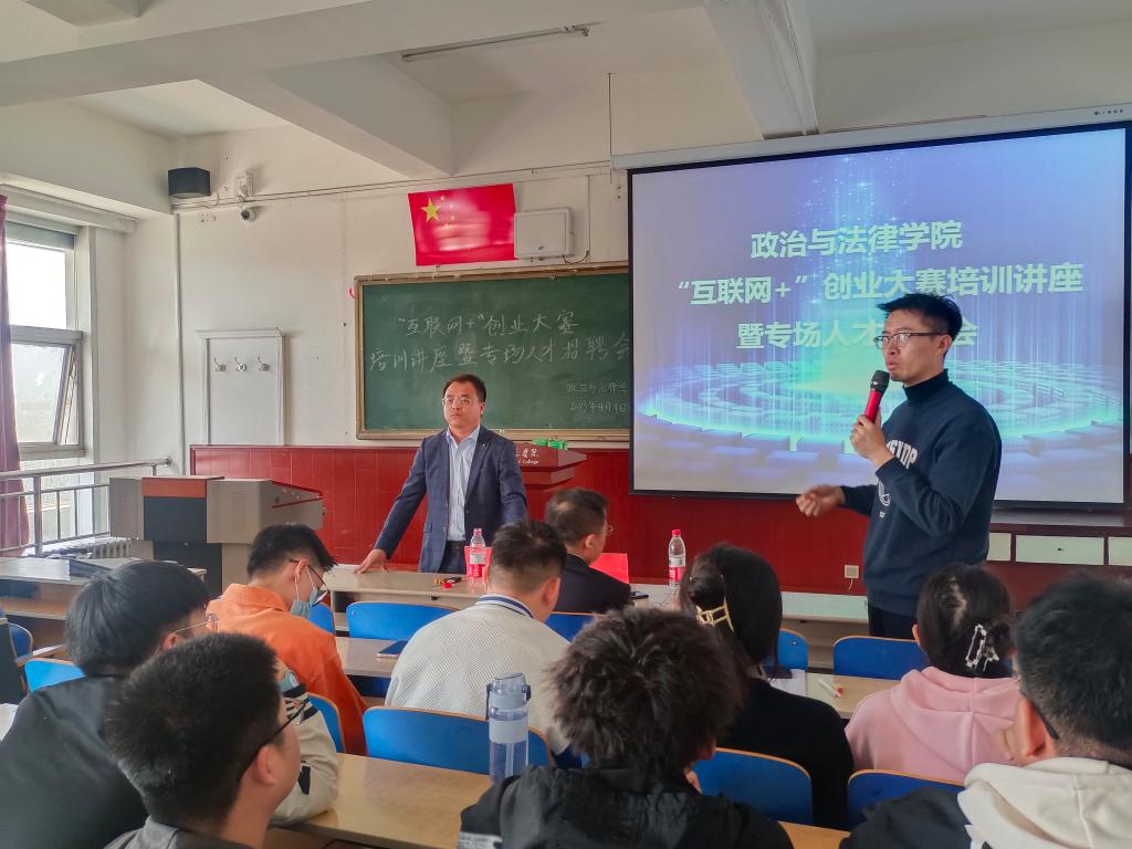 为迎接第九届中国国际“互联网+”大学生创新创业大赛,充分发挥优秀校友的榜样示范作用,促进2019届毕业生高质量就业,2023年4月1日,政法学院在博学楼600教室举办了“互联网+”创业、大赛培训讲座暨专场人才招聘会。我校优秀校友、内蒙古蒙特利尔农业发展有限公司总经理李亚飞、政法学院党总支副书记郭宏升、辅导员赵鹏然出席了会议,大四在校全体毕业生、大一到大三班委会团支部成员和学生代表参加了会议。