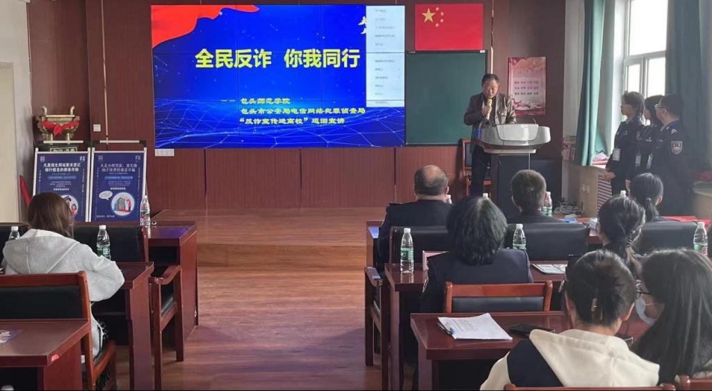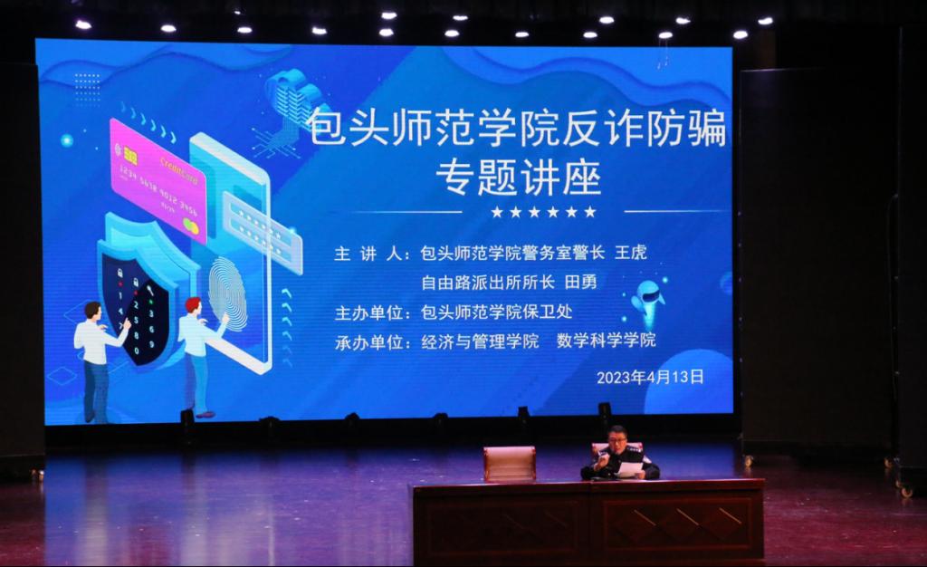 为有效遏制当前电信网络诈骗高发势头,切实增强广大师生的安全防范意识和能力。4月13日,经济与管理学院联合我校保卫处和数学科学学院在我校会堂和新逸夫楼622教室同步开展反诈防骗专题讲座,实现学院学生全覆盖。特邀包头师范学院警务室警长王虎、自由路派出所所长田勇,包头市公安局电信网络犯罪侦查局刘时嘉警官主讲,学校保卫处领导、老师参加。