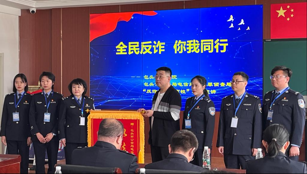 学生为表达对反诈中心警官的感激之情,向为同学们宣讲的警官献上了“以法之名、护航青春”锦旗。