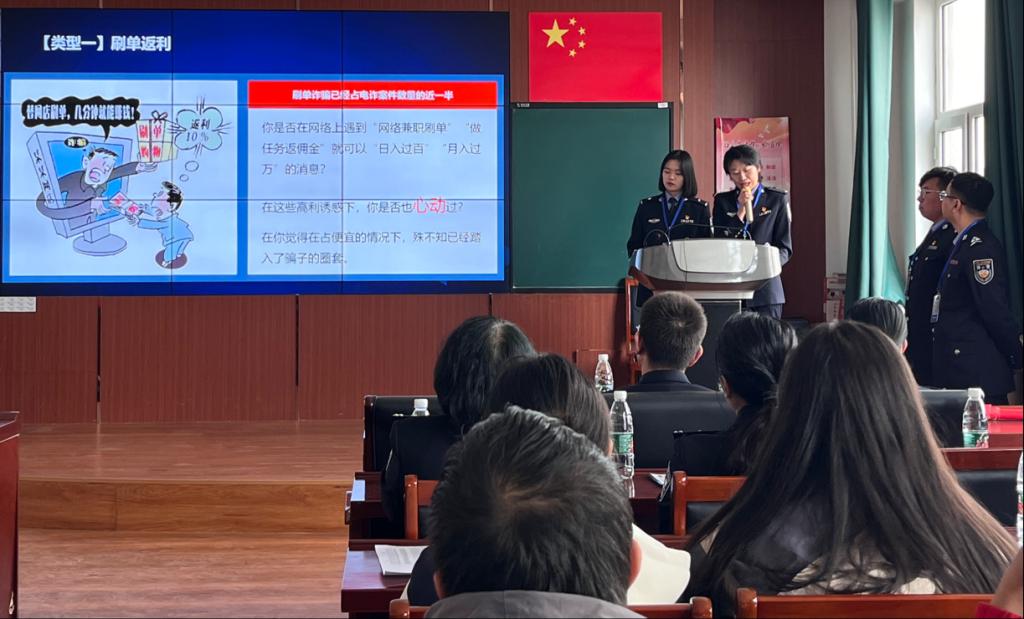 讲座上,王虎通过具体案例介绍近期院校电信诈骗案件情况,深入阐述电信诈骗的危害性,提醒同学们谨记天上不会掉馅饼,拒绝不劳而获。