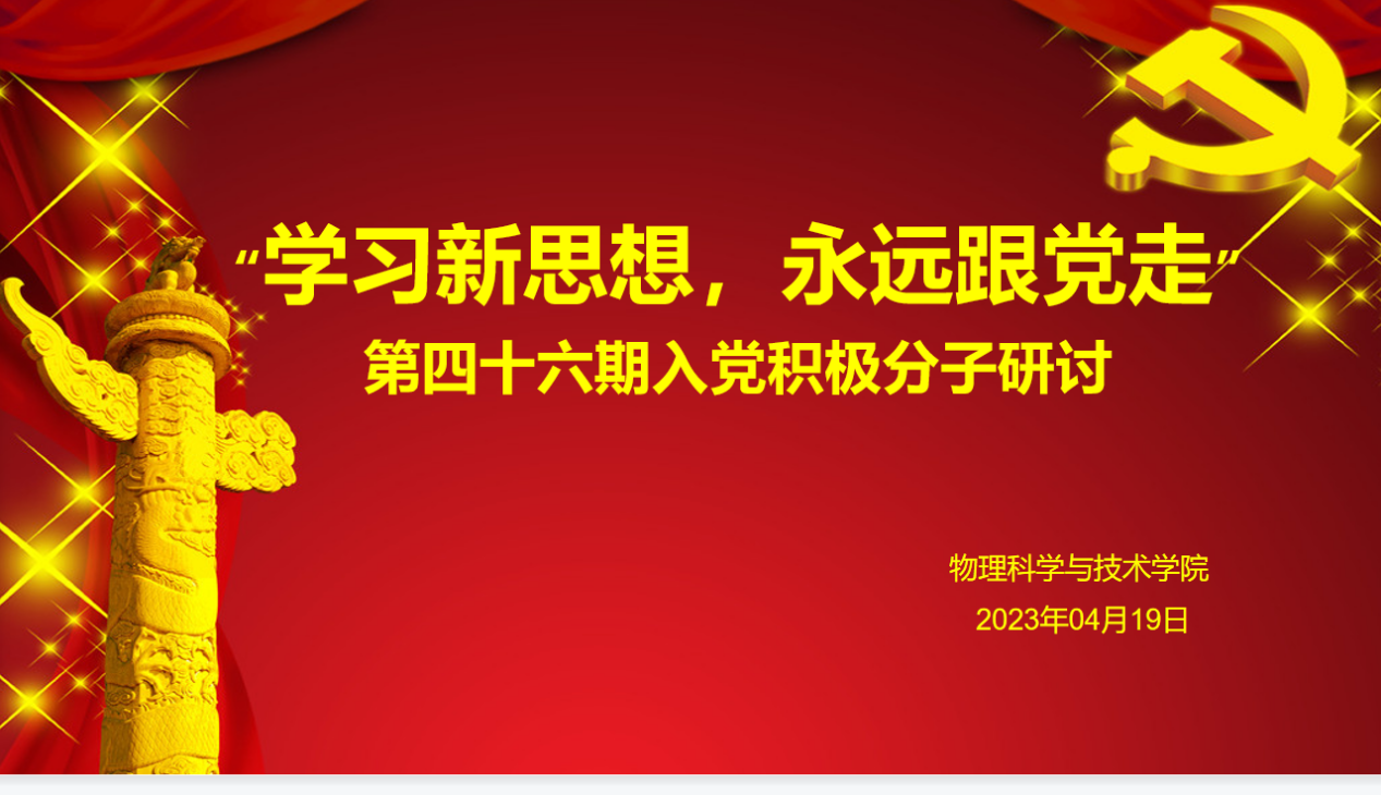 为进一步引领学院青年学生学习贯彻落实党的二十大精神,提高入党积极分子的思想觉悟,端正入党动机。物理科学与技术学院于4月19日在新逸夫楼427举行了第46期入党积极分子开班仪式及研讨。学院党总支书记李慧龙、辅导员、组织员郑霞、学生第一党支部书记王兴生、第二党支部书记包建华参加了本次活动。