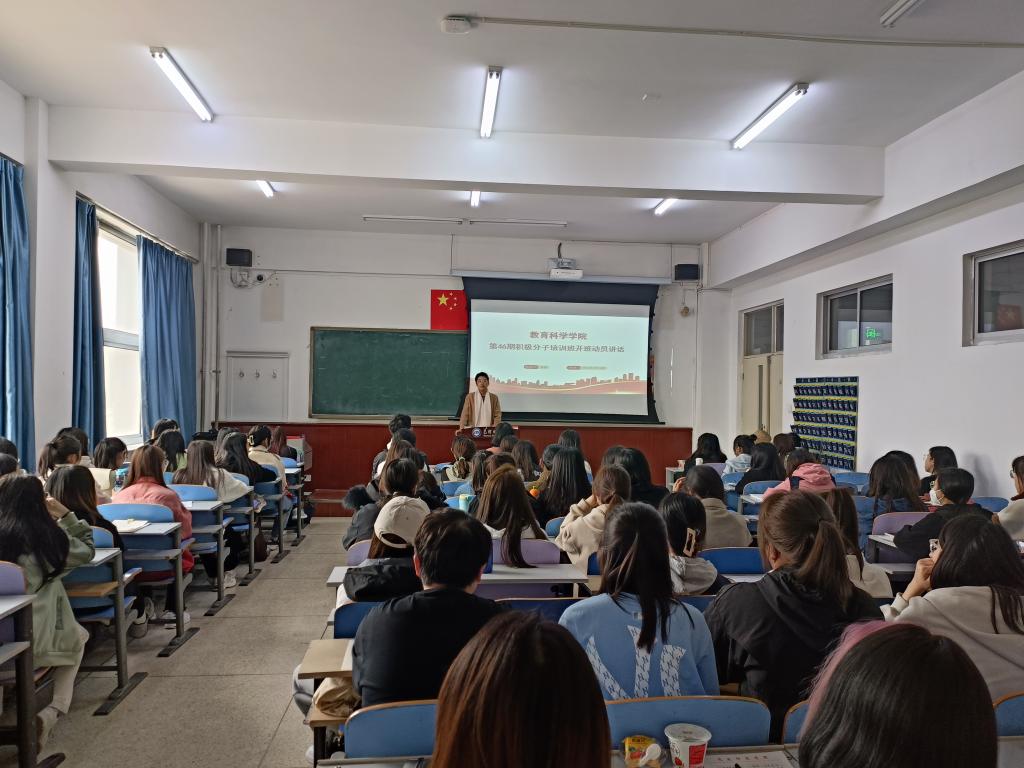 为了进一步加强入党积极分子全面了解和掌握党的基本知识,端正入党动机,坚定加入中国共产党的信念,明确肩负的责任和使命,教育科学学院党总支于4月20日在博东203举办了第46期积极分子培训班开班仪式。