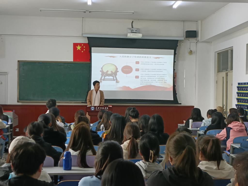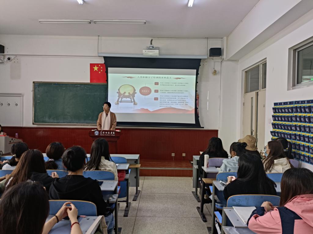 培训班开班仪式由党总支副书记李燕作了动员讲话。首先,李燕老师强调举办入党积极分子培训的重要意义。她指出开展培训是入党积极分子熟悉和掌握党的基本知识、基本理论的需要;是入党积极分子端正入党动机,提高思想政治觉悟的需要;是严格党员发展程序,提高党员发展质量的需要。其次,李燕老师对入党积极分子们提出了三点希望。希望入党积极分子们深刻理解培训班的目的;希望入党积极分子们树立正确的入党动机,努力做到思想上入党;希望入党积极分子们进一步加强思想道德修养,努力做到行动上入党。第三,李燕老师对本期入党积极分子提出了明确的纪律要求。一要遵守学习纪律,树立良好形象;二要理论联系实际,做到学以致用。上课认真听讲,认真思考,记好学习笔记。课下要保质保量完成学习内容和心得撰写,学员之间要互相促进,互相交流探讨,更好地提高学习效果,真正做到学有所思、学有所获、学有所得。